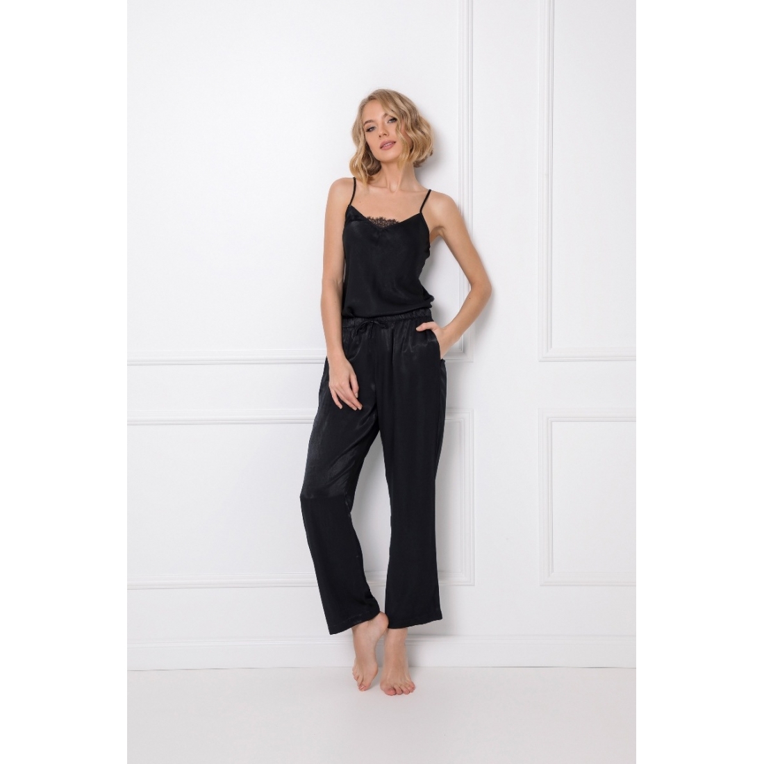 Добавьте изысканности в свой день с помощью этой элегантной и романтичной пижамы Dominique. Верхняя часть пижамы украшена нежным кружевом. Штаны с карманами и эластичным поясом, дополнительно украшены небольшим бантиком.