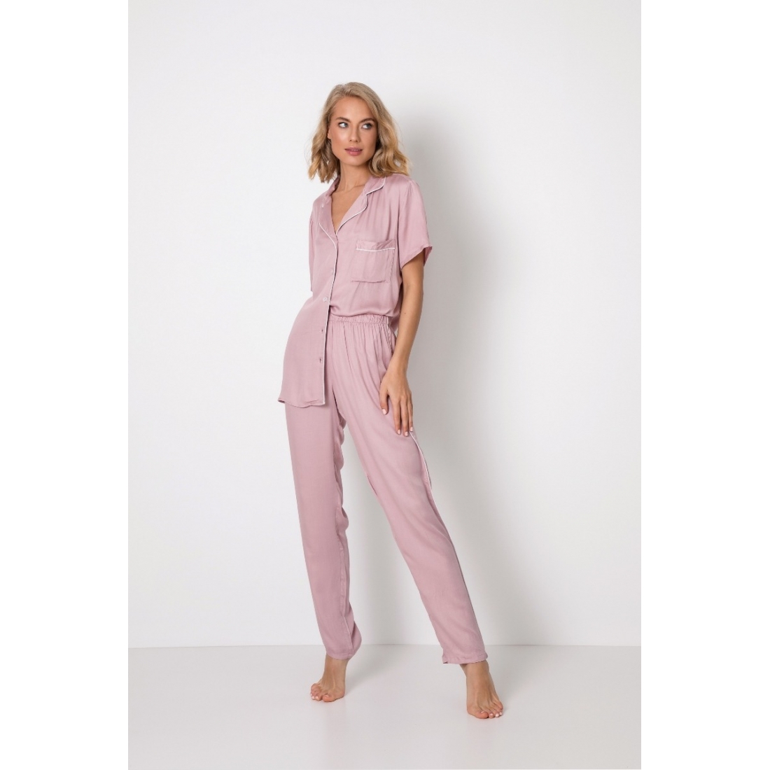 Когда розовый - это все, что вам нужно, пижама Tianna здесь для вас! Пижама рубашечного типа в классическом стиле изготовлена из сверхмягкой блестящей вискозы. Воротник и нагрудный карман украшены кантом, а брюки средней посадки имеют элемент канта сбоку.