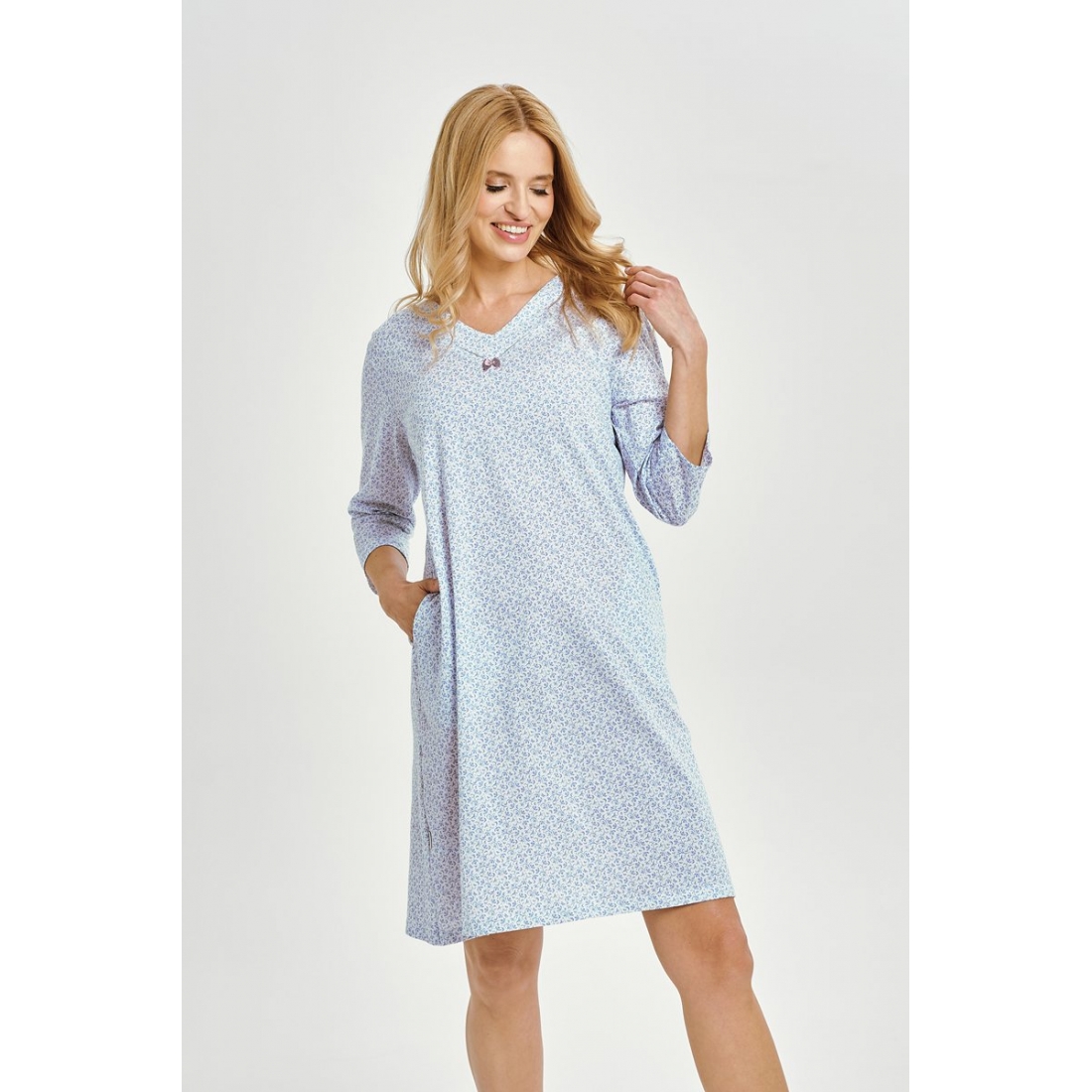 На уровне бедер карманы. Длинный рукав, V-образный вырез украшен атласным бантом, по бокам карманы.