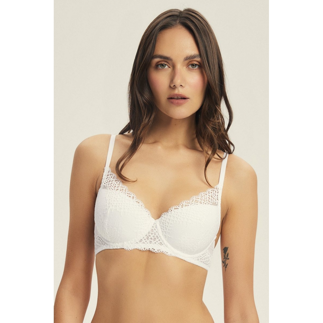 Бюстгальтер от европейского производителя Esotiq. Поролоновая чашка на кости со съемным вкладышем пуш-ап, на базе Kassidy. Несъемные регулируемые бретели. Золотые детали. Внутренняя поверхность чашек хлопковая. Чашки покрыты нежным кружевом. Стан кружевной на подкладе из микросетки. Состав: кружево 86% полиамид, 14% эластан; сетка 68% полиэстер, 32% эластан; подклад чашки 100% хлопок.
