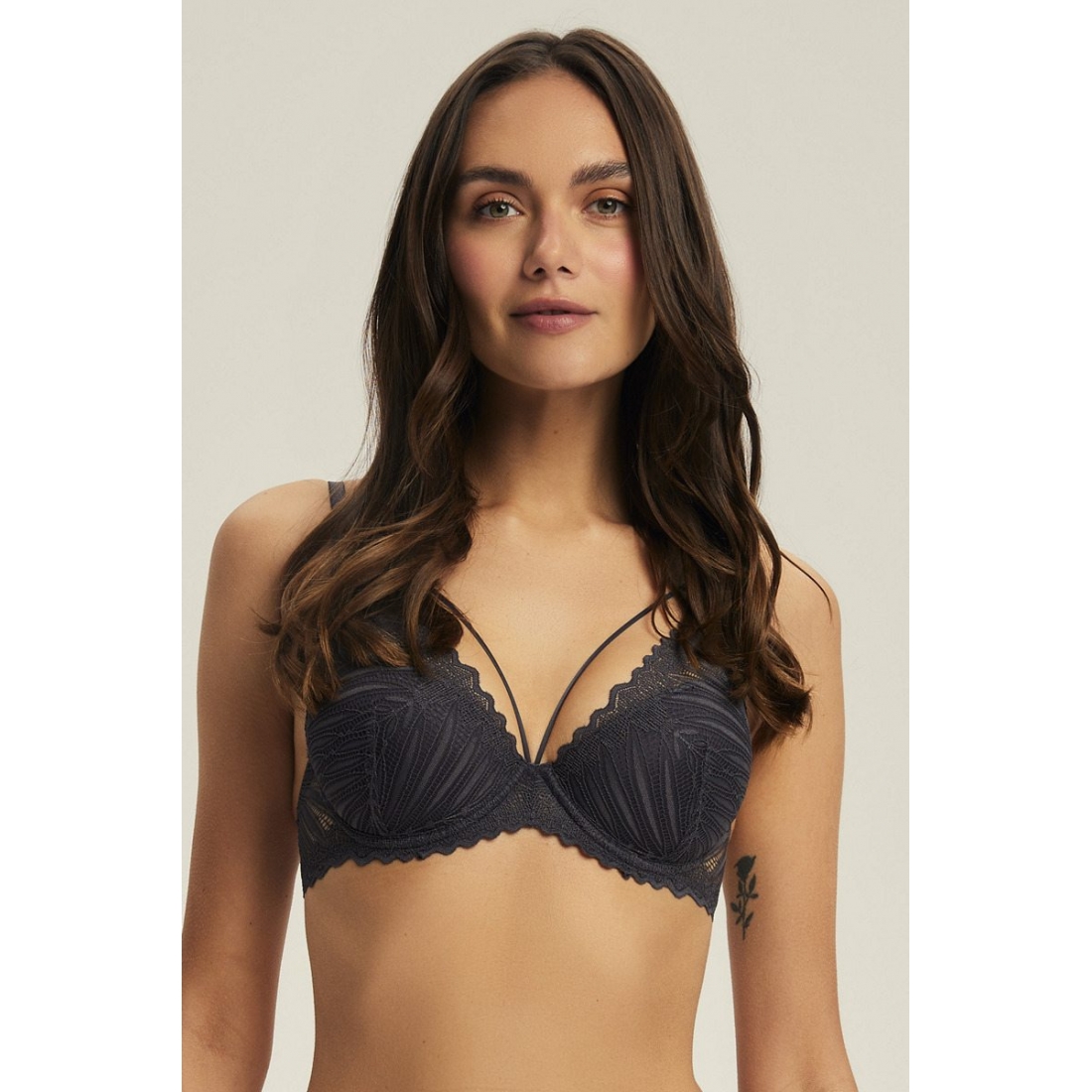 Кружевной бюстгальтер от европейского производителя Esotiq. Поролоновая чашка на кости со съемным пуш-ап. На базе Kassidy. Несъемные регулируемые бретели. Спереди несъемный стреп. Золотые детали. Внутренняя поверхность чашек хлопковая. Состав: кружево 88% полиамид, 12% эластан; сетка 75% полиамид, 25% эластан; подклад чашки 100% хлопок.