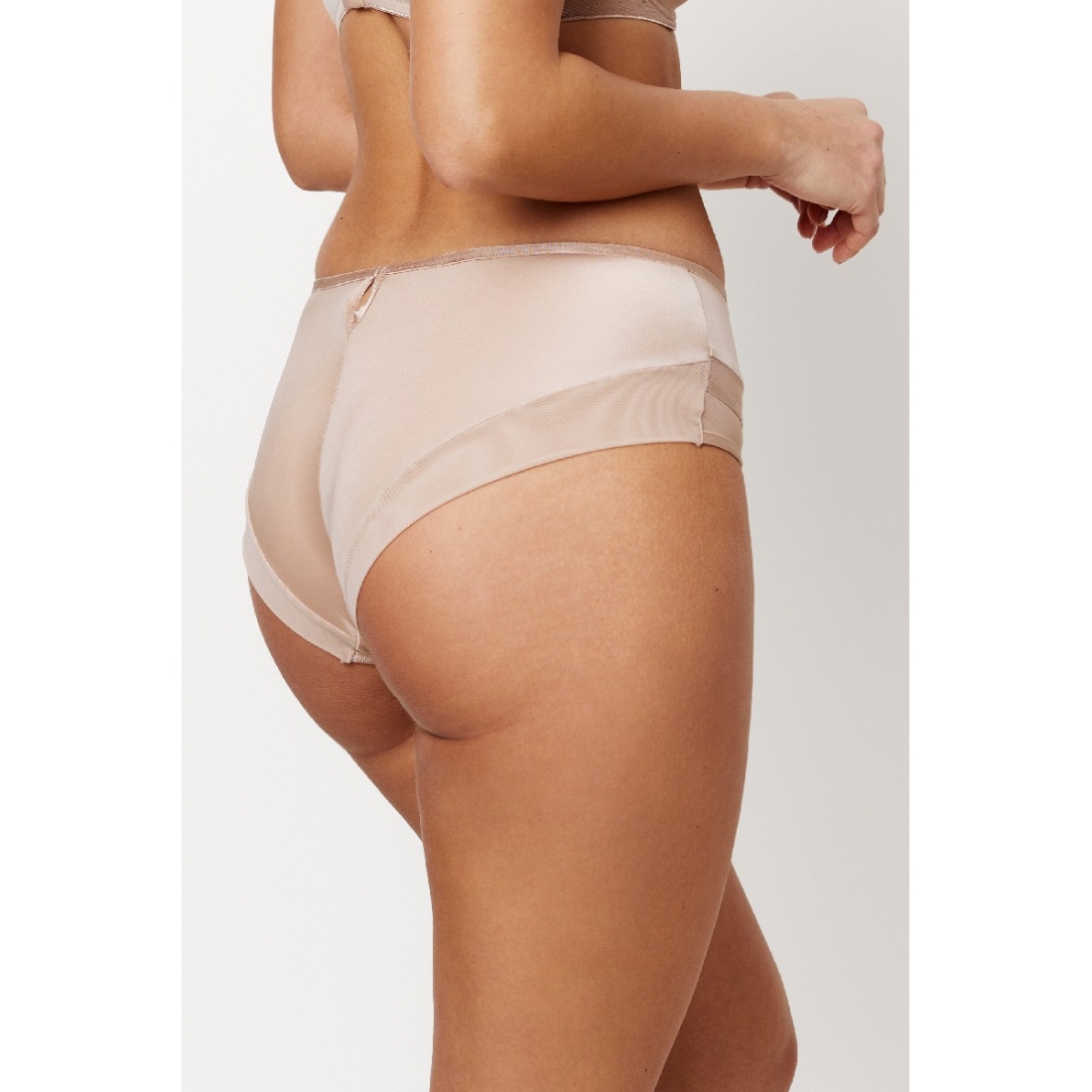 Трусы CHORS от европейского производителя Subtille. Модель конструкции бразильяно, с более широким боком, выполнена из микрофибры с добавлением вставок из микросетки. На попе двойной тюль. Спереди трусики декорированы золотистым небольшим колечком.