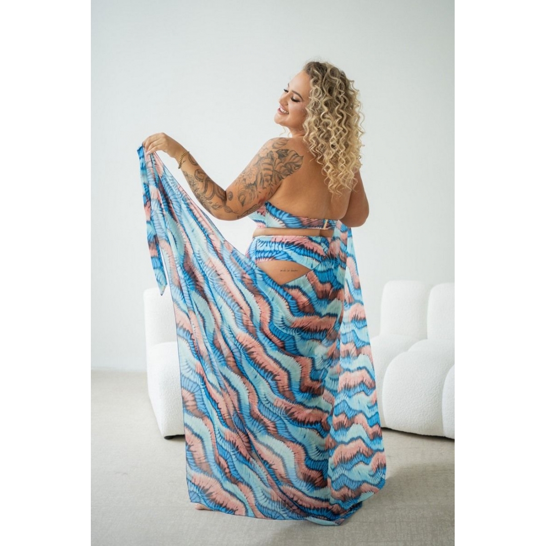 Размеры парео: ширина 149 см, высота 140 см, длина завязок 53 см.