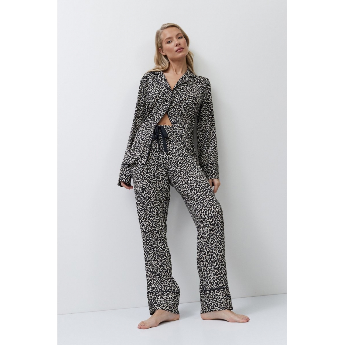 Пижама женская со штанами LEONA для вашего ночного комфорта. Пижама выполнена из вискозы с легким эластаном, с животным принтом. Рубашка на пуговицах, с длинными рукавами и отложным воротником. Окантовка дополняет и украшает комплект. Штаны свободные, с эластичным поясом с завязкой. Расслабьтесь с максимальным комфортом и стилем в пижаме LEONA.
