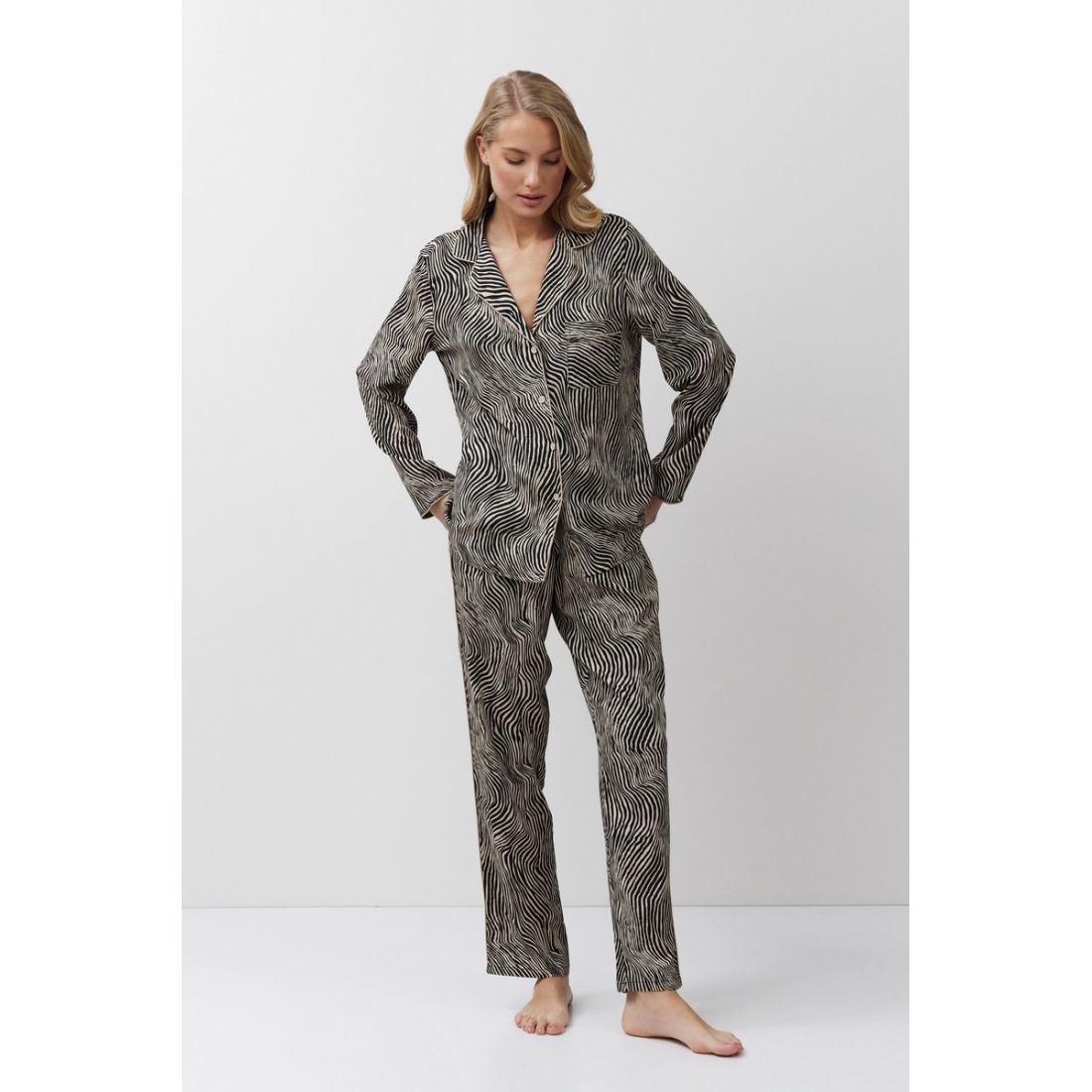 Пижама женская со штанами LINNA для вашего ночного комфорта. Пижама выполнена из вискозы с легким эластаном, с животным принтом. Рубашка на пуговицах, с длинными рукавами, отложным воротником и нагрудным карманом. Окантовка дополняет и украшает комплект. Штаны свободные, с эластичным поясом с завязкой. Расслабьтесь с максимальным комфортом и стилем в пижаме LINNA.