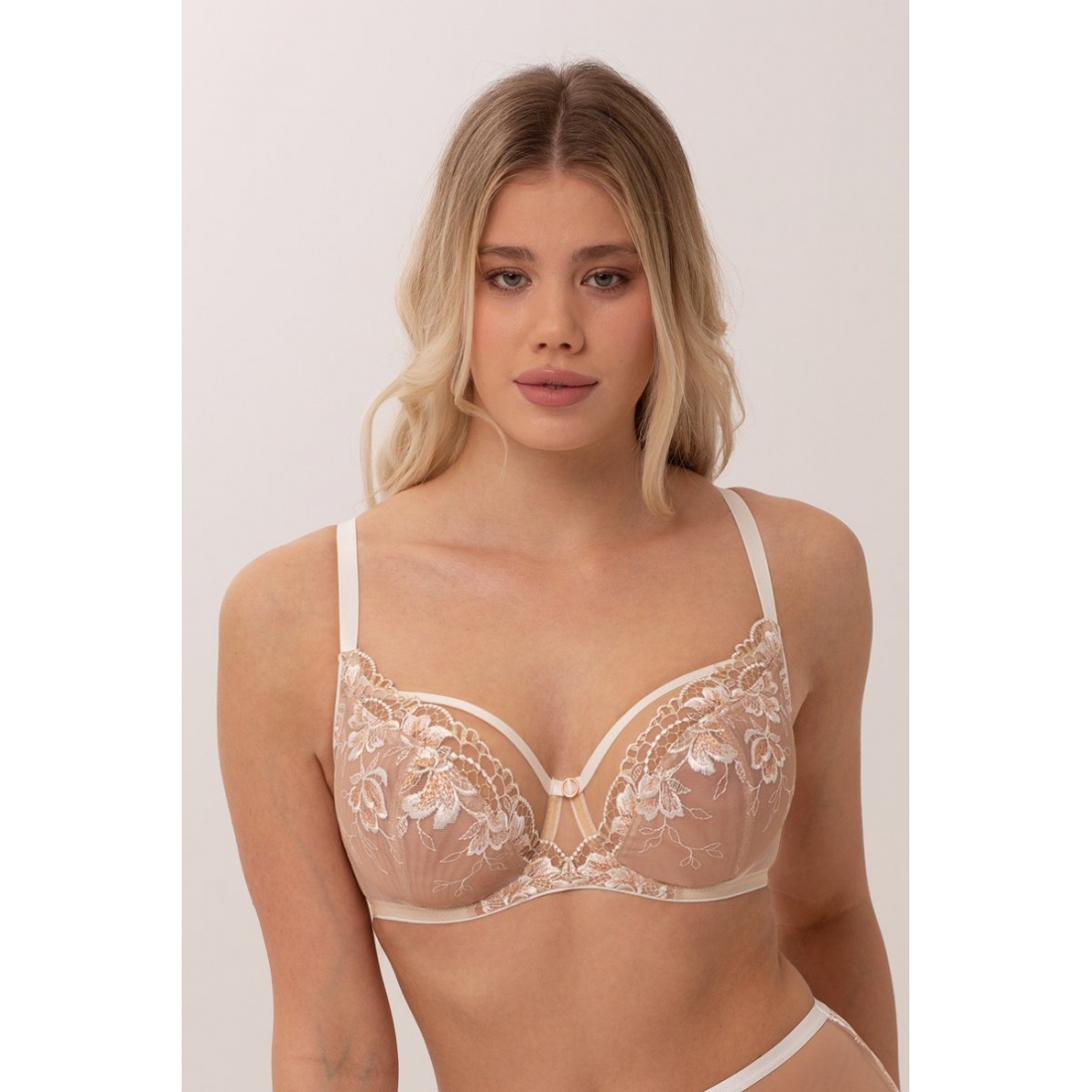 Бюстгальтер PATRICIA Soft от европейского производителя Subtille. Выполнен из нежной микросетки с цветочной вышивкой. Мягкая чашка на кости в конструкции S-01, не глубокий, балконированный, форма MIRANDA. Несъемные регулируемые бретели. Золотые детали.