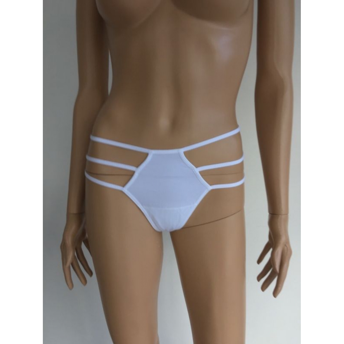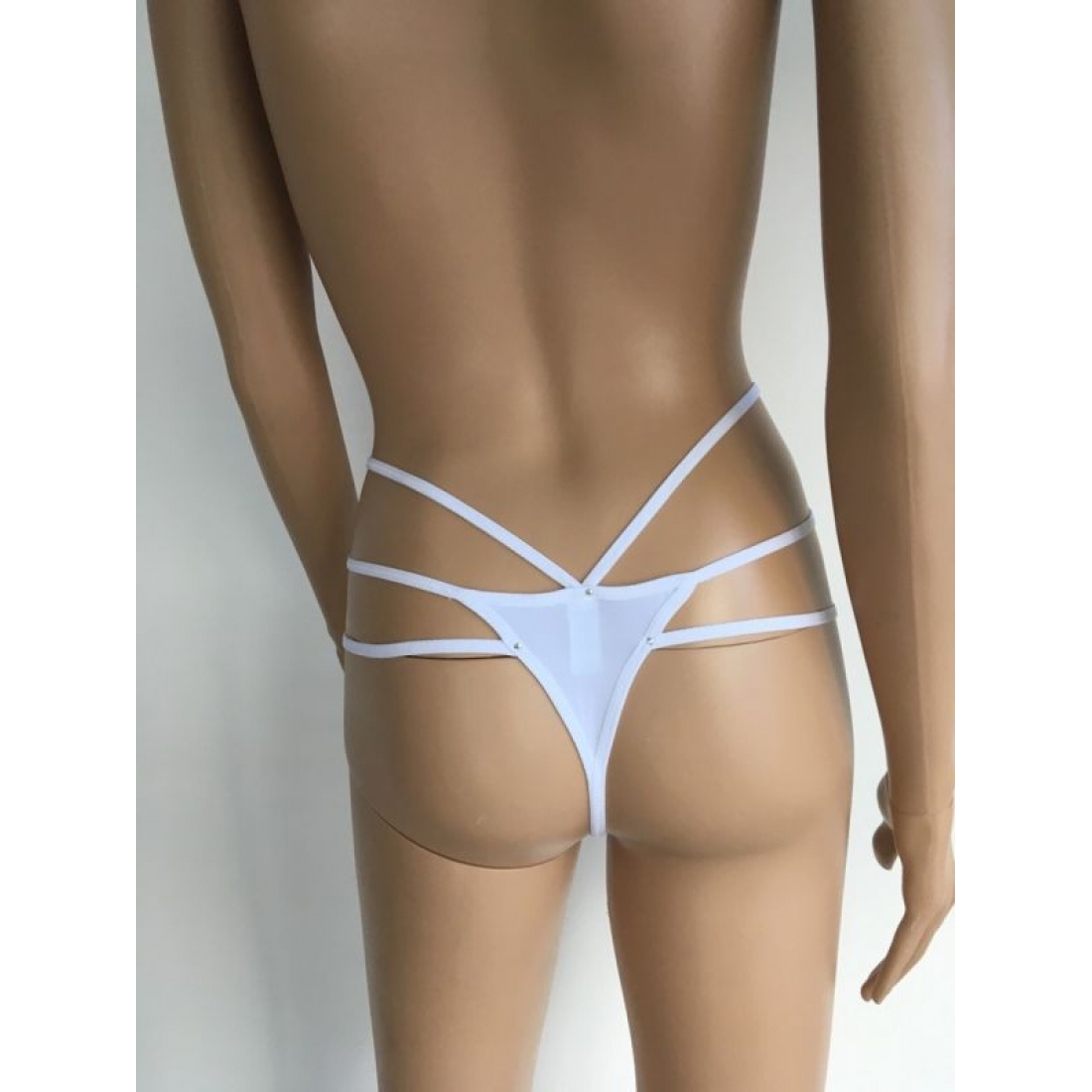 Описание: Трусики стринг в виде ромба спереди и треугольника сзади. С каждого бока от передней части к задней тянется по 3 резинки. Места их соединения с задним треугольником украшены стразами.